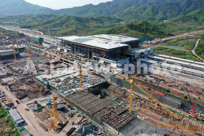 4月10日,位于浙江省东阳市的杭温高铁横店站房、站前广场及相关配套设施建设现场,施工人员和大型机械正在忙碌施工作业,现场一片繁忙景象。