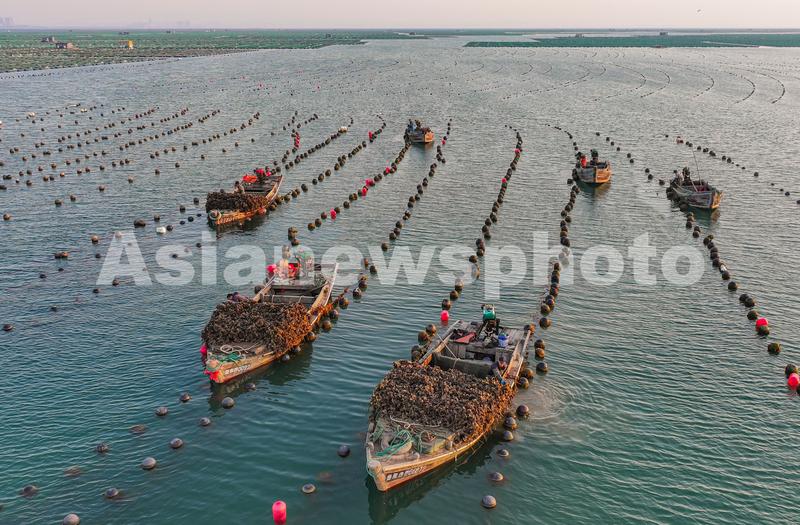 图片说明:2024年4月9日,在山东省荣成市石岛管理区桑沟湾海洋牧场生态养殖区,渔民在采收牡蛎。