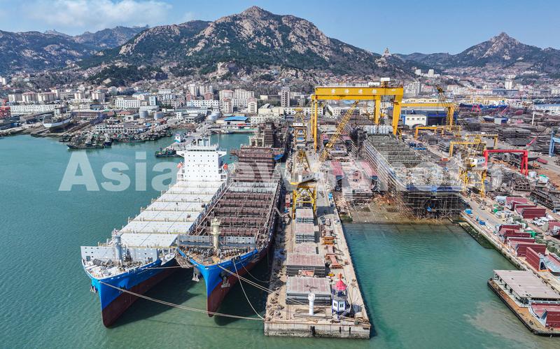 2024年4月11日,在山东省荣成市石岛管理区修造船产业基地船坞内,一派繁忙景象,泊位上停满各类在建、待修、维护保养的大型船舶,多艘大中型LNG船、集装箱船、南极磷虾捕捞加工船等特种船舶订单等待交付。