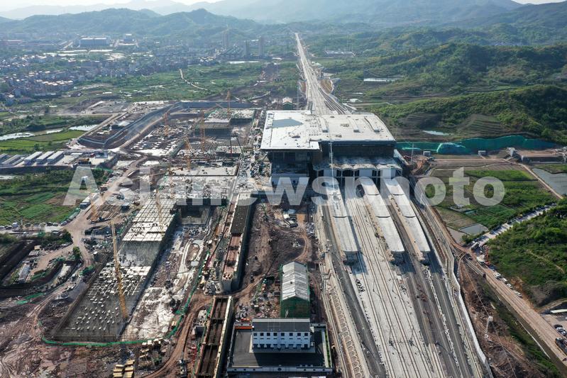 4月10日,位于浙江省东阳市的杭温高铁横店站房、站前广场及相关配套设施建设现场,施工人员和大型机械正在忙碌施工作业,现场一片繁忙景象。