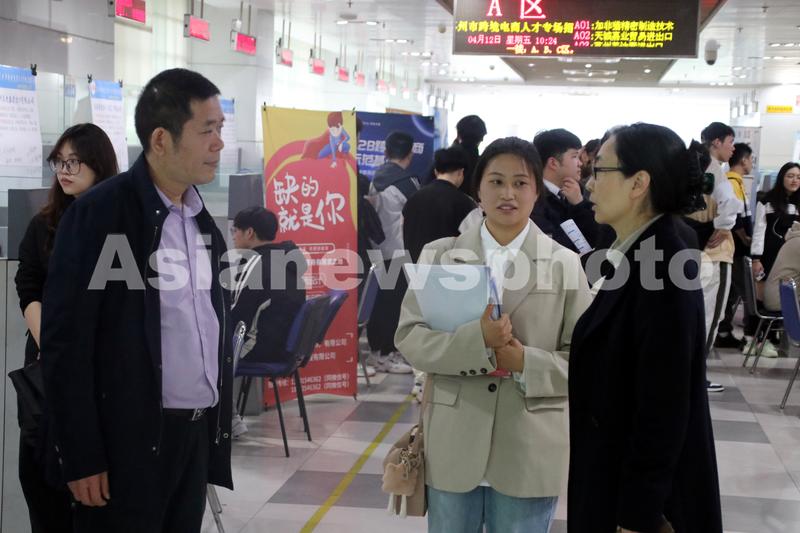 图片说明:2024年4月12日,求职者在苏州市跨境电商人才专场招聘会寻找职位。