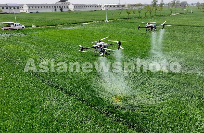 4月16日,在安徽省亳州市利辛县胡集镇陈营社区麦田,农民利用植保无人机对小麦进行“一喷三防”作业,防治小麦赤霉病。