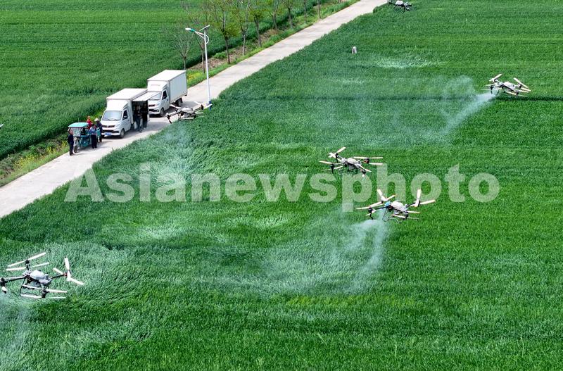 4月16日,在安徽省亳州市利辛县胡集镇陈营社区麦田,农民利用植保无人机对小麦进行“一喷三防”作业,防治小麦赤霉病。