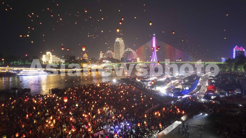 4月13日晚,人们在云南省景洪市澜沧江边放飞孔明灯。