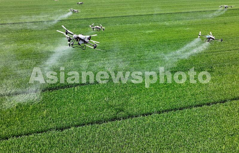 4月16日,在安徽省亳州市利辛县胡集镇陈营社区麦田,农民利用植保无人机对小麦进行“一喷三防”作业,防治小麦赤霉病。