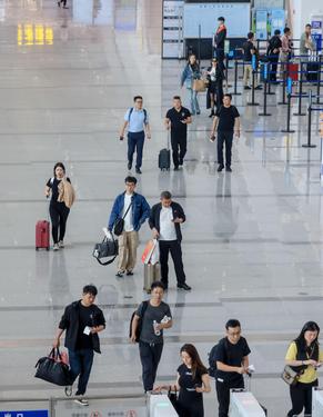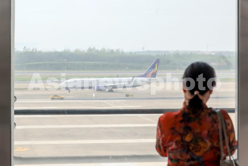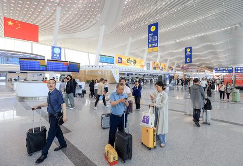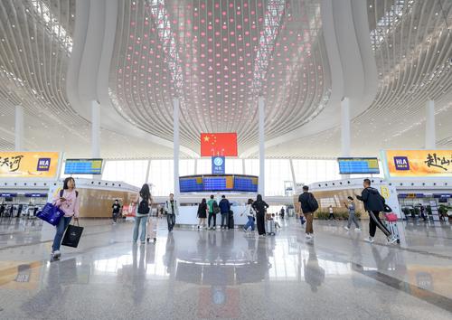 4月15日,旅客在武汉天河机场T2航站楼游览。