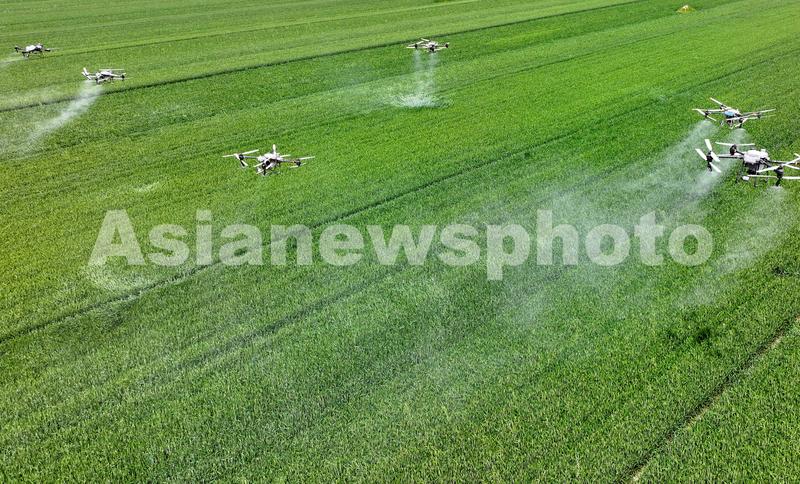 4月16日,在安徽省亳州市利辛县胡集镇陈营社区麦田,农民利用植保无人机对小麦进行“一喷三防”作业,防治小麦赤霉病。