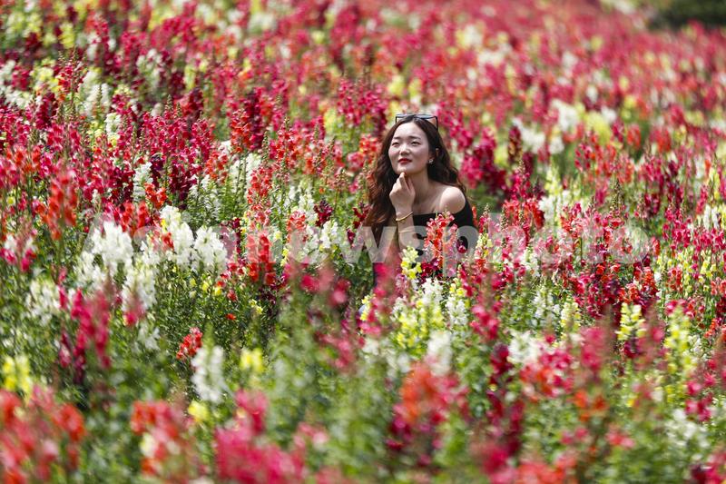 图片说明:2024年4月15日,市民在安徽省黄山市屯溪区新安江畔公园观赏金鱼草花。