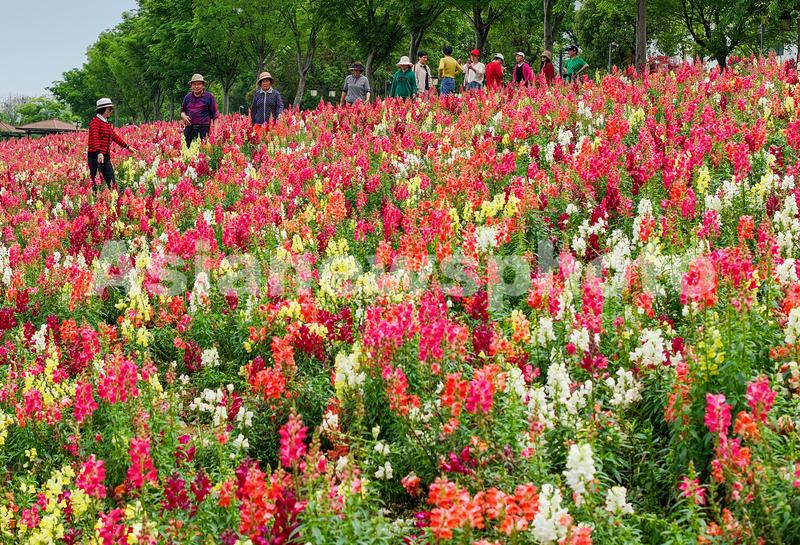 图片说明:2024年4月15日,市民在安徽省黄山市屯溪区新安江畔公园观赏金鱼草花。(无人机照片)