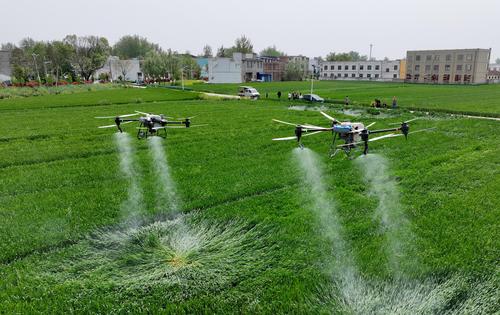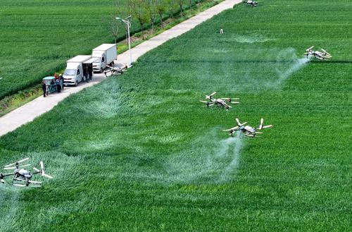 4月16日,在安徽省亳州市利辛县胡集镇陈营社区麦田,农民利用植保无人机对小麦进行“一喷三防”作业,防治小麦赤霉病。
