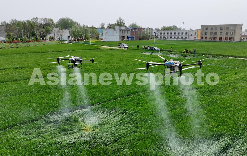 4月16日,在安徽省亳州市利辛县胡集镇陈营社区麦田,农民利用植保无人机对小麦进行“一喷三防”作业,防治小麦赤霉病。