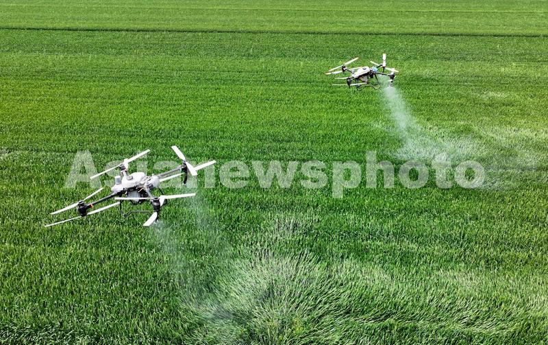 4月16日,在安徽省亳州市利辛县胡集镇陈营社区麦田,农民利用植保无人机对小麦进行“一喷三防”作业,防治小麦赤霉病。