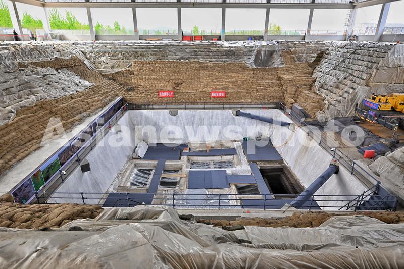 图片说明:4月16日拍摄的武王墩一号大墓发掘现场。