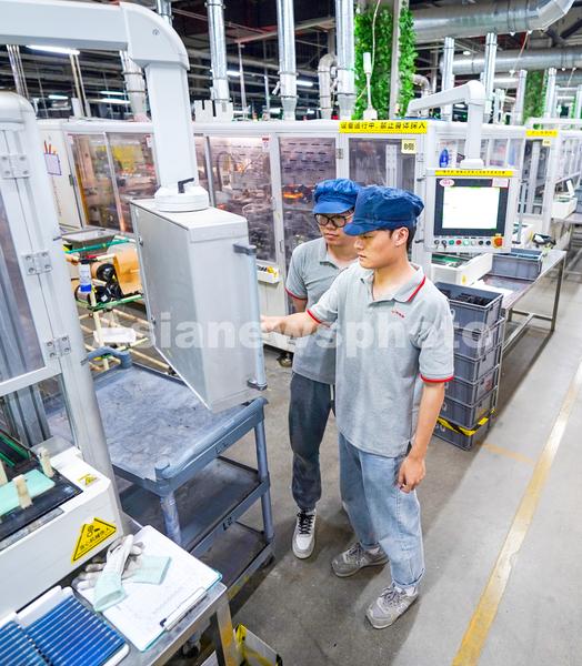 图片说明:2024年4月17日,江苏省宿迁经济技术开发区阿特斯阳光能源科技有限公司的生产车间内,技术人员在智能车间里忙碌,为交付国内外客户订单忙着赶制高效光伏组件。
