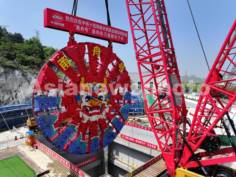 甬舟铁路工程:金塘海底隧道“甬舟号”盾构机刀盘顺利下井 查看组图