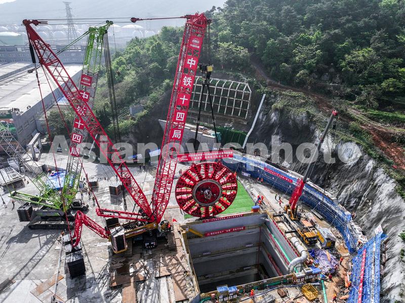 图片说明:2024年4月18日,甬舟铁路工程金塘海底隧道宁波侧施工现场,一台起重能力800吨的履带吊正在把一个直径14.57米、重460吨的盾构机刀盘吊装下井,并成功将刀盘安装在主驱动上,这标志着“甬舟号”盾构机组装完成,世界最长海底高铁隧道盾构机始发进入倒计时。