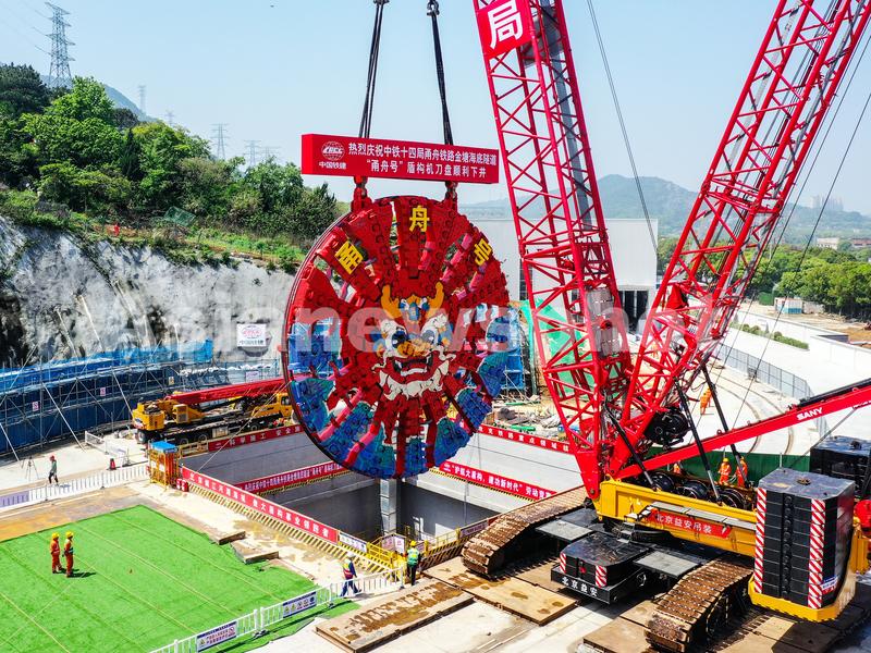 甬舟铁路工程:金塘海底隧道“甬舟号”盾构机刀盘顺利下井 查看组图