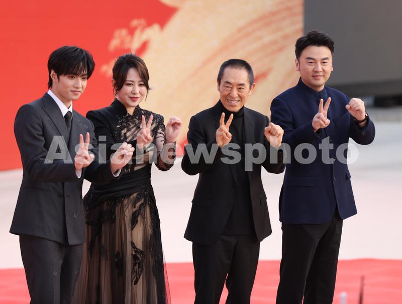 电影《第二十条》导演张艺谋(右二)携演员马丽(左二)、雷佳音(右一)、 刘耀文亮相红毯仪式。