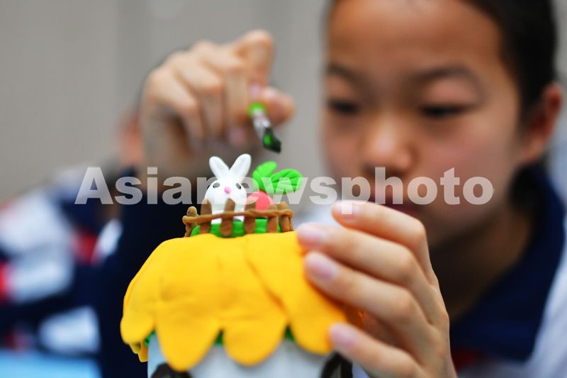 2024年4月22日,在山东省青岛市市北区嘉定路小学开展的“世界地球日”主题教育活动上,一名学生在利用废旧材料制作“生态小屋”。