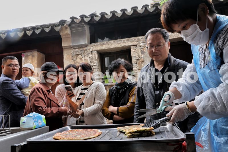 图片说明:4月21日,人们在焦溪古镇购买早点。