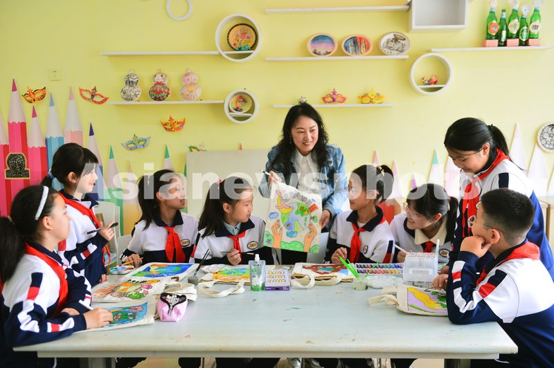 2024年4月22日,在山东省青岛市市北区嘉定路小学开展的“世界地球日”主题教育活动上,师生共绘环保袋,倡导减少塑料袋的使用。