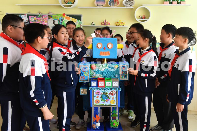 2024年4月22日,在山东省青岛市市北区嘉定路小学开展的“世界地球日”主题教育活动上,学生们在自制的垃圾分类机器人前抢答分类知识。