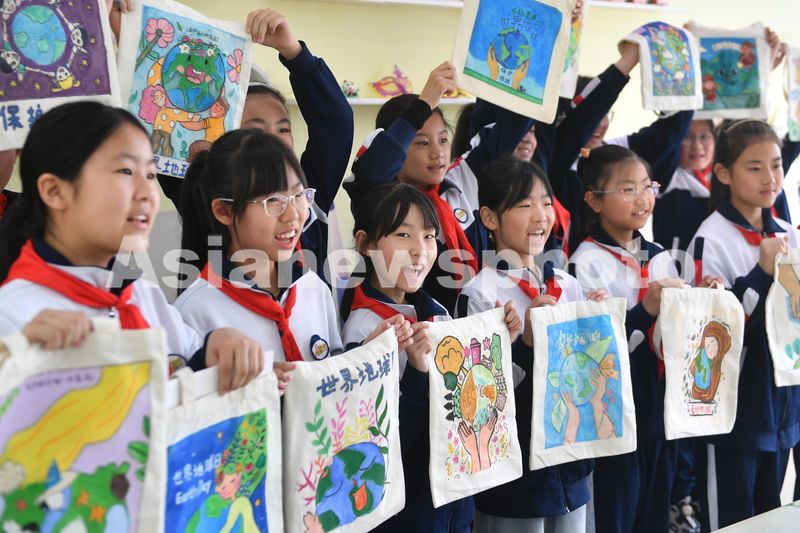 2024年4月22日,在山东省青岛市市北区嘉定路小学开展的“世界地球日”主题教育活动上,学生们展示自己设计的环保袋。