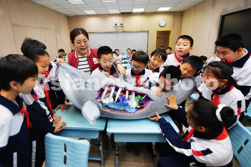 2024年4月22日,在山东省青岛市市北区嘉定路小学开展的“世界地球日”主题教育活动上,老师为学生们科普鱼类等海洋生物吃进塑料垃圾的危害。