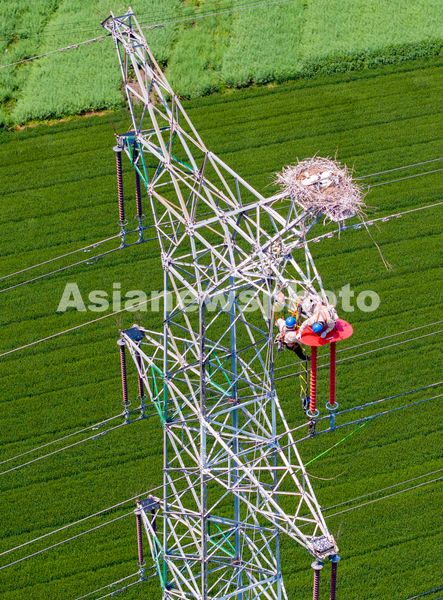 图片说明:2024年4月22日,电力工人在兴化市临城街道冷家村一输电铁塔的东方白鹳鸟巢下安装护鸟板(无人机照片)。