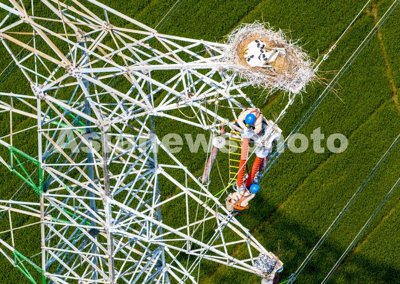 图片说明:2024年4月22日,电力工人在兴化市临城街道冷家村一输电铁塔的东方白鹳鸟巢下更换被鸟粪污染的绝缘子瓷瓶串(无人机照片)。