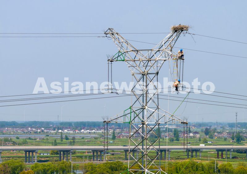 图片说明:2024年4月22日,电力工人在兴化市临城街道冷家村一输电铁塔的东方白鹳鸟巢下更换被鸟粪污染的绝缘子瓷瓶串(无人机照片)。