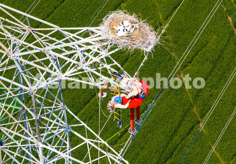 图片说明:2024年4月22日,电力工人在兴化市临城街道冷家村一输电铁塔的东方白鹳鸟巢下安装护鸟板(无人机照片)。