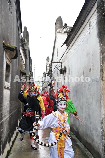 2024年4月23日,广东省揭阳市普宁市华溪村英歌舞表演队应游客邀请表演英歌舞,近40名男青年和少年脸上画着代表梁山好汉的脸谱,穿着色彩鲜艳的服饰,在村里的传统民居旁、老巷内演绎英歌舞。队员们粗犷多变的步伐与刚劲豪迈的动作令游客们赞叹不已,从中感受到英歌舞的独特魅力。