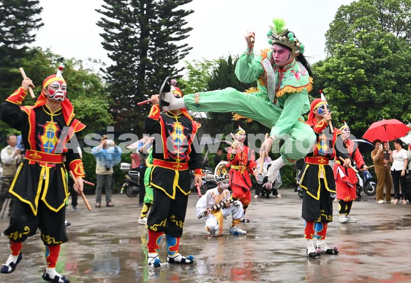 2024年4月23日,广东省揭阳市普宁市华溪村英歌舞表演队队员在表演英歌舞。