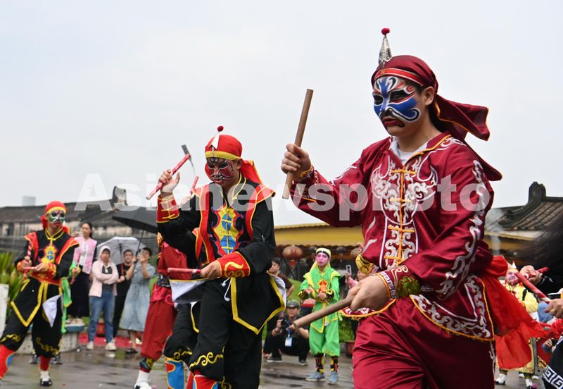 2024年4月23日,广东省揭阳市普宁市华溪村英歌舞表演队应游客邀请表演英歌舞,近40名男青年和少年脸上画着代表梁山好汉的脸谱,穿着色彩鲜艳的服饰,在村里的传统民居旁、老巷内演绎英歌舞。队员们粗犷多变的步伐与刚劲豪迈的动作令游客们赞叹不已,从中感受到英歌舞的独特魅力。