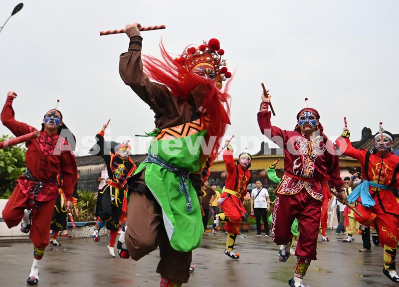 2024年4月23日,广东省揭阳市普宁市华溪村英歌舞表演队应游客邀请表演英歌舞,近40名男青年和少年脸上画着代表梁山好汉的脸谱,穿着色彩鲜艳的服饰,在村里的传统民居旁、老巷内演绎英歌舞。队员们粗犷多变的步伐与刚劲豪迈的动作令游客们赞叹不已,从中感受到英歌舞的独特魅力。