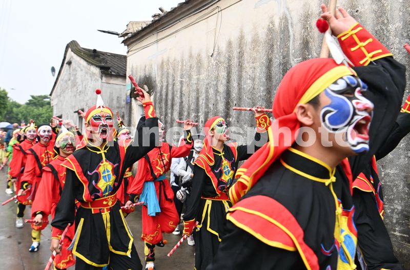 2024年4月23日,广东省揭阳市普宁市华溪村英歌舞表演队应游客邀请表演英歌舞,近40名男青年和少年脸上画着代表梁山好汉的脸谱,穿着色彩鲜艳的服饰,在村里的传统民居旁、老巷内演绎英歌舞。队员们粗犷多变的步伐与刚劲豪迈的动作令游客们赞叹不已,从中感受到英歌舞的独特魅力。
