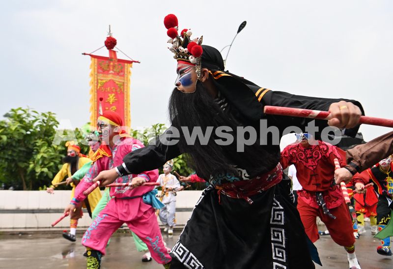 2024年4月23日,广东省揭阳市普宁市华溪村英歌舞表演队队员在表演英歌舞。