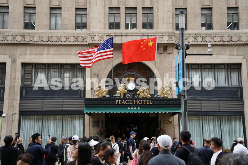 图片说明:2024年4月25日,上海和平饭店沿南京路步行街的入口上方悬挂了中国五星红旗和美国星条旗。