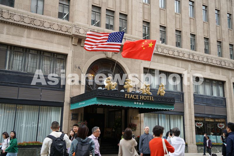 上海和平饭店悬挂中美两国国旗 查看组图