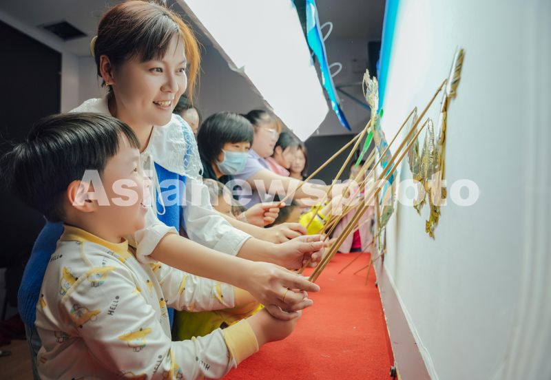 图片说明:2024年4月24日,浙江省湖州市长兴县画溪街道包桥中心幼儿园,孩子们在体验皮影戏表演。