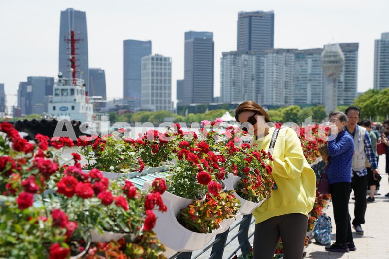 图片说明:2024年4月24日,游客在上海徐汇滨江的2024花展现场赏花。