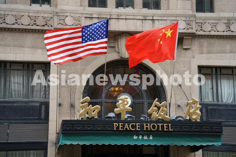 上海和平饭店悬挂中美两国国旗 查看组图