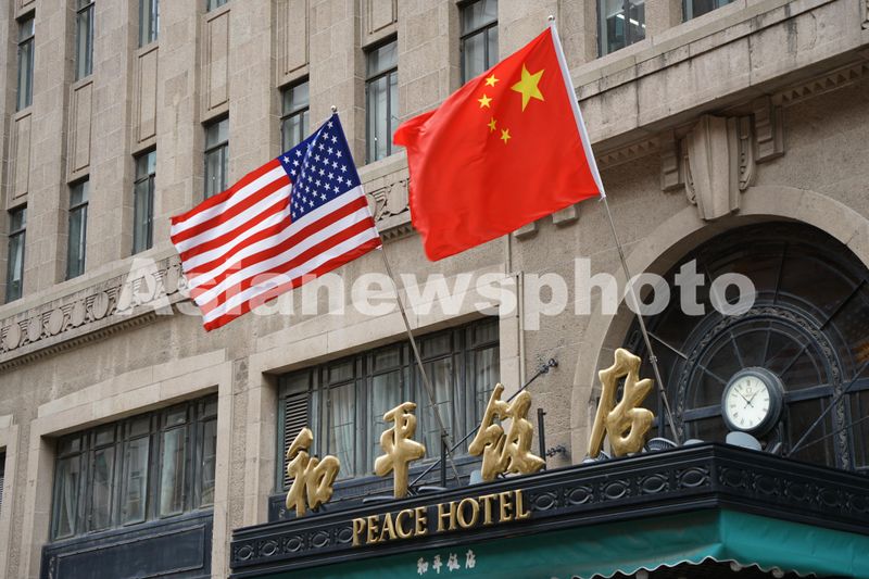 图片说明:2024年4月25日,上海和平饭店沿南京路步行街的入口上方悬挂了中国五星红旗和美国星条旗。