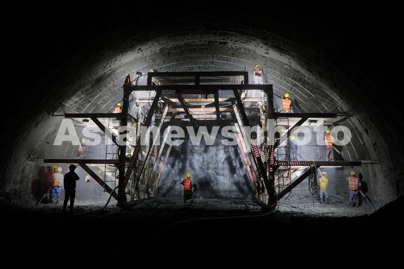 图片说明:2024年4月25日,江西省重点工程遂(川)至大(余)高速五指峰隧道施工现场,机械设备的轰鸣声此起彼伏,工人们忙着隧道开挖、二衬浇筑等作业。