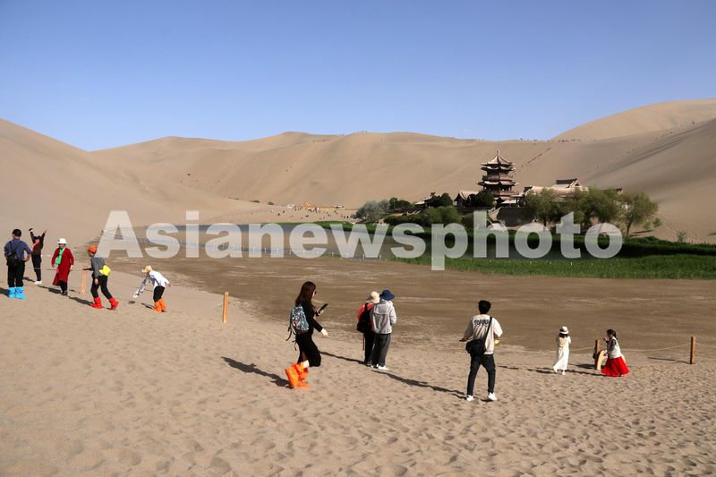 图片说明:2024年4月24日,游客在甘肃省敦煌市鸣沙山月牙泉景区游览。