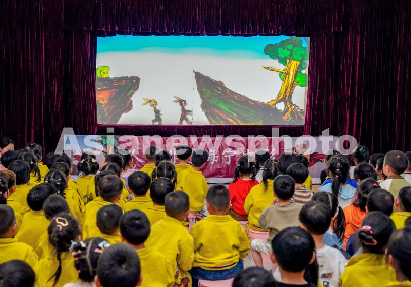 图片说明:2024年4月24日,浙江省湖州市长兴县画溪街道包桥中心幼儿园,孩子们在观看皮影戏表演。