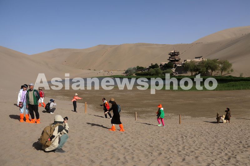 图片说明:2024年4月24日,游客在甘肃省敦煌市鸣沙山月牙泉景区游览。