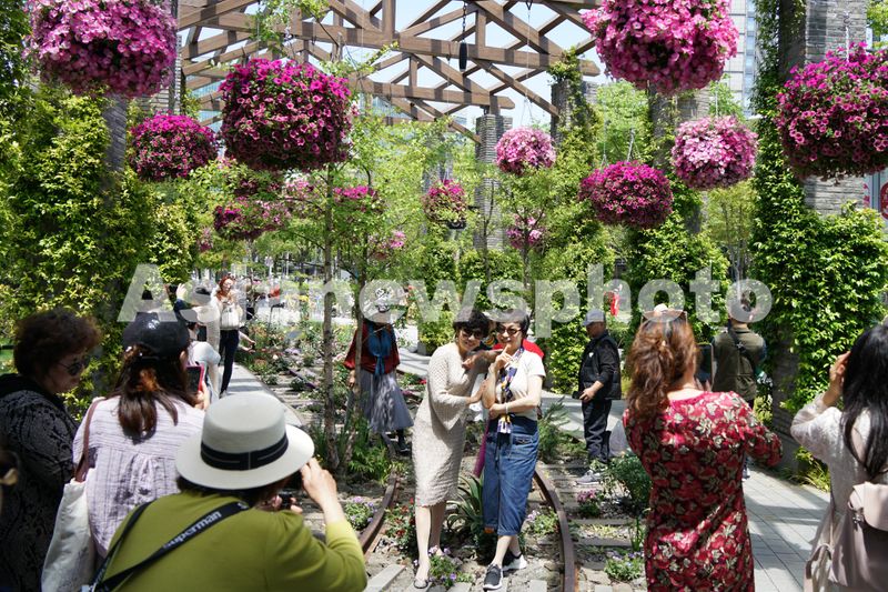图片说明:2024年4月24日,游客在上海徐汇滨江的2024花展现场赏花。
