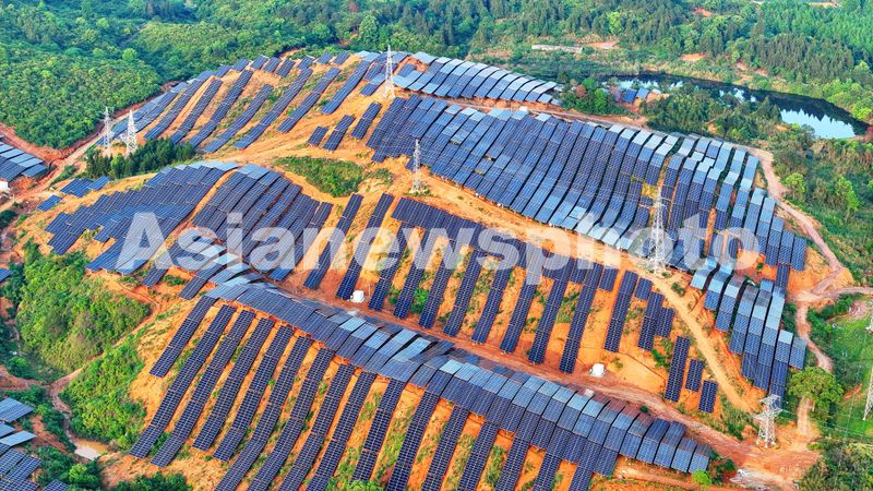 2024年4月23日,江西吉安永新县莲洲乡的一座石漠化荒山建起一排排光伏发电板,源源不断地输出绿色能源。